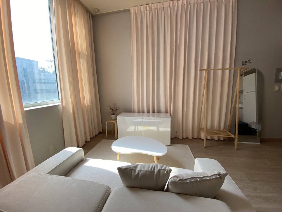 1층은 베이지 암막 커튼으로