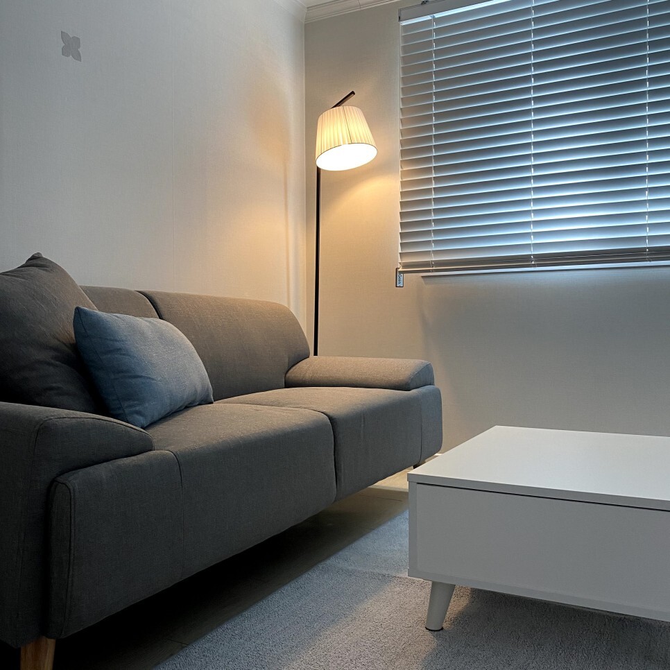 장스탠드와 그레이 색상의 쇼파로 포인트를 주었어요
